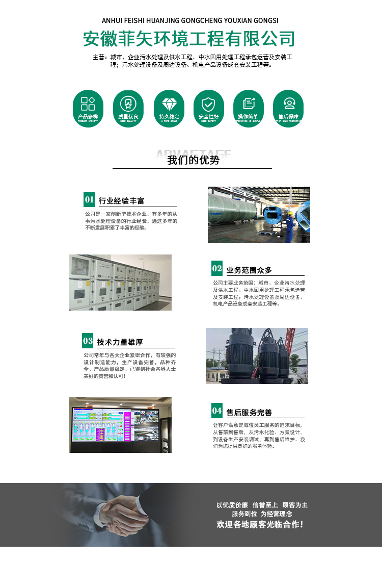 安徽菲矢環境工程有限公司是致力于環保技術創新、環保設備制造、環保產品集成供應和相關技術服務為一體的環保專業技術企業。以環保高科技為先導、以吸收較強技術為基礎,以改進創新為發展動力,以加工制造為根本,開發并推出多項具有競爭力的產品,形成了技術不斷創新、產品質量不斷提高的發展局面。